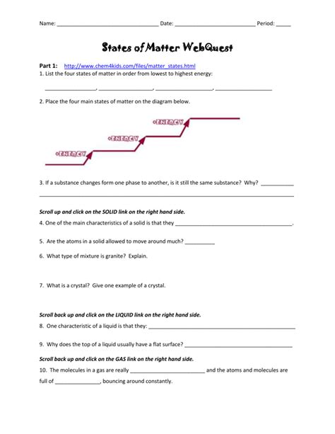 Print off the matter webquest worksheet 2. There are three common states of matter: You will visit the website below and then watch the video titled states of matter to learn more about this topic. Scroll up and click on the solid link on the right hand side. If a substance changes from one phase to another, is it still.